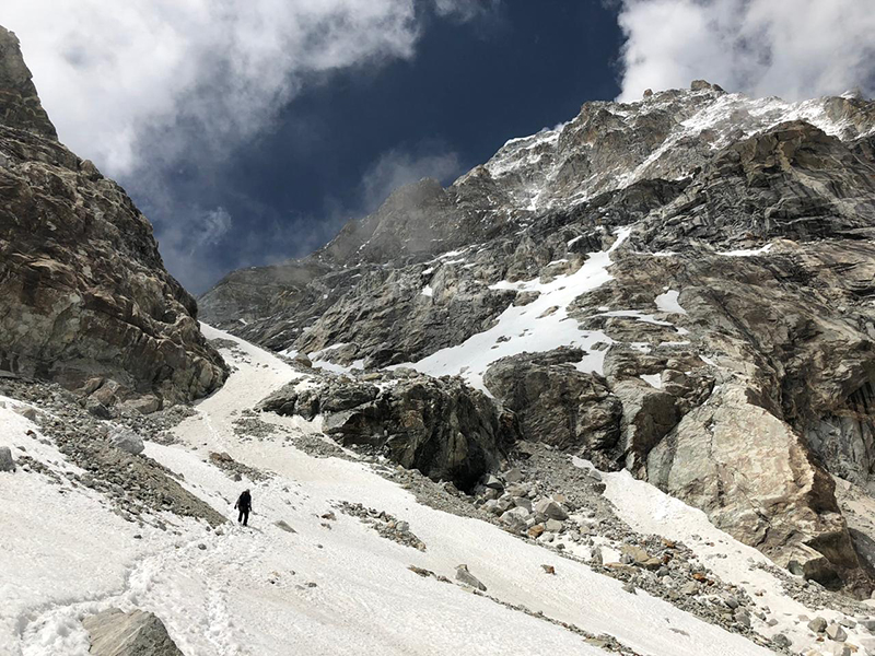 - Camp 1 to Camp 2 (5,700m): Short but challenging scramble over scree and boulders